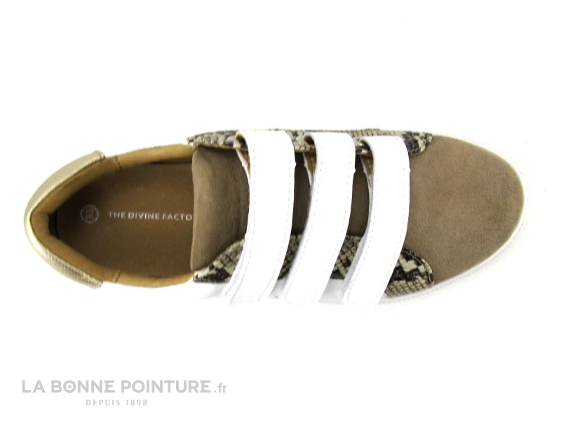 Cette basket basse Femme est blanche et beige, avec des bandes aspect python ainsi que l’arrière dorĂ©.