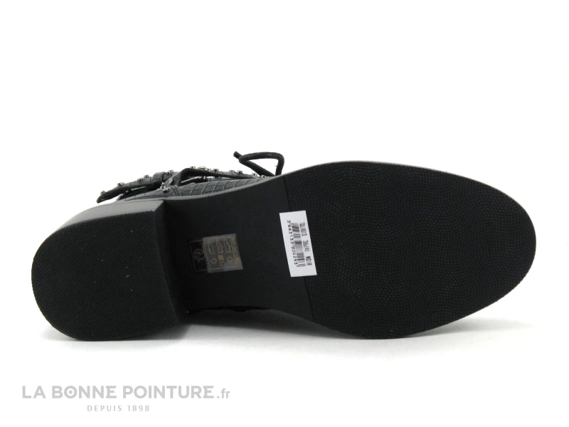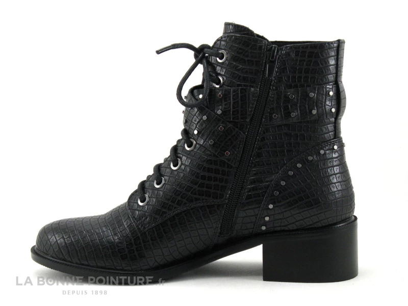 Cette bottine Ă lacet Femme imitation serpent est toute noire, avec deux lanières ornĂ©es de petits clous argentĂ©s, que l’on retrouve aussi Ă l’arrière sur le contrefort.