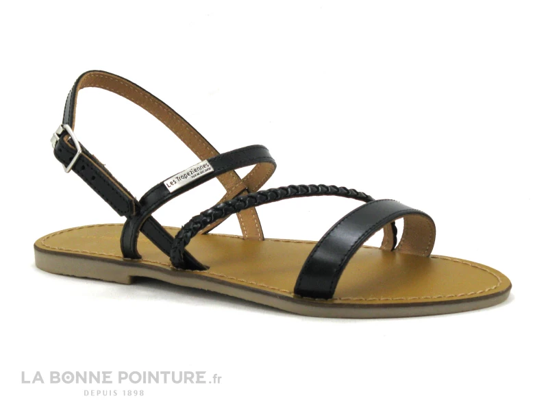 Cette sandale plate Tropezienne Batresse est en cuir lisse noir, avec une bride tressée en biais qui habille joliment le pied.