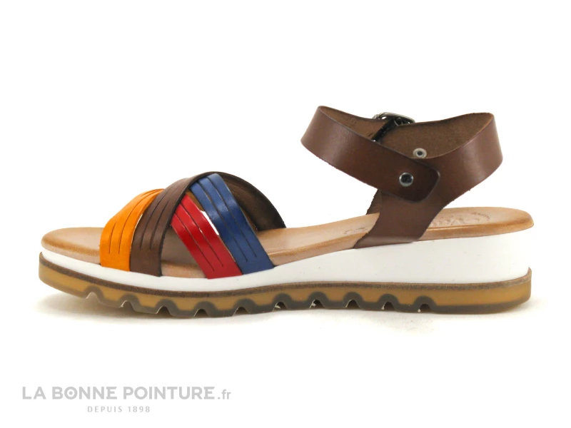 Ce nu-pieds multicolore Femme est en cuir marron clair, avec ces lanières bleu marine, orange et rouge croisées sur le dessus.