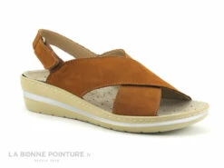Cette sandale confort Femme est en cuir velouté marron camel, avec 2 larges brides qui se croisent sur le dessus du pied.