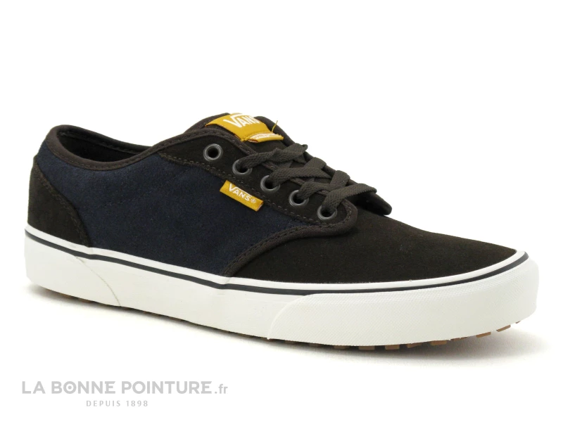 Cette belle basket Homme Vans Atwood Vansgua est en cuir velours bleu marine et marron chocolat, avec deux étiquettes jaunes marquées Vans sur la languette et sur le côté.