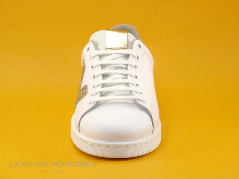 Ces baskets blanches Victoria 125188 sont en cuir enduit blanc, avec l’arrière et le « V » de Victoria en paillettes dorées sur le côté.