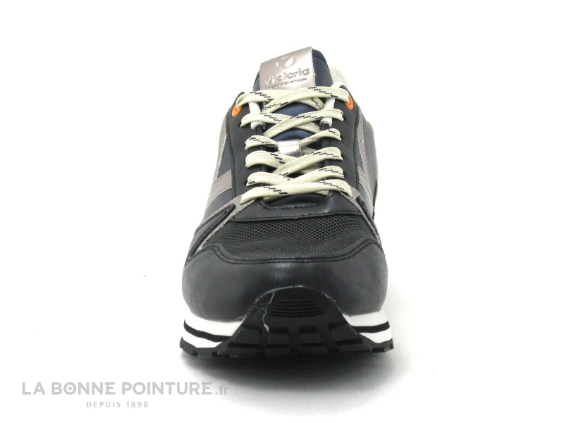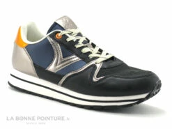 Cette basket originale Femme Victoria mélange du noir et du bleu marine avec des parties métallisées orange croco et argent.