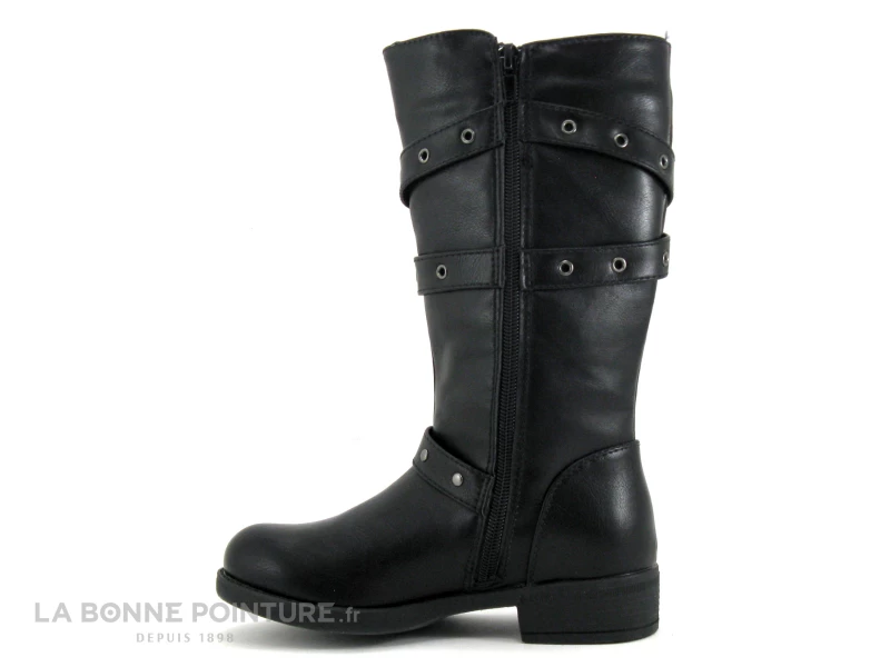 Cette botte fille Wipop est en simili cuir noir aspect veiné, avec des lanières ornées de clous et d’oeillets argentés.