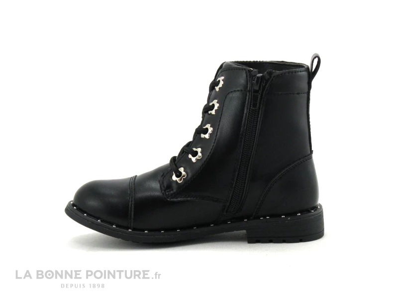 Cette chaussure montante enfant est en simili cuir noir, ornée de petits clous argentés sur la semelle.